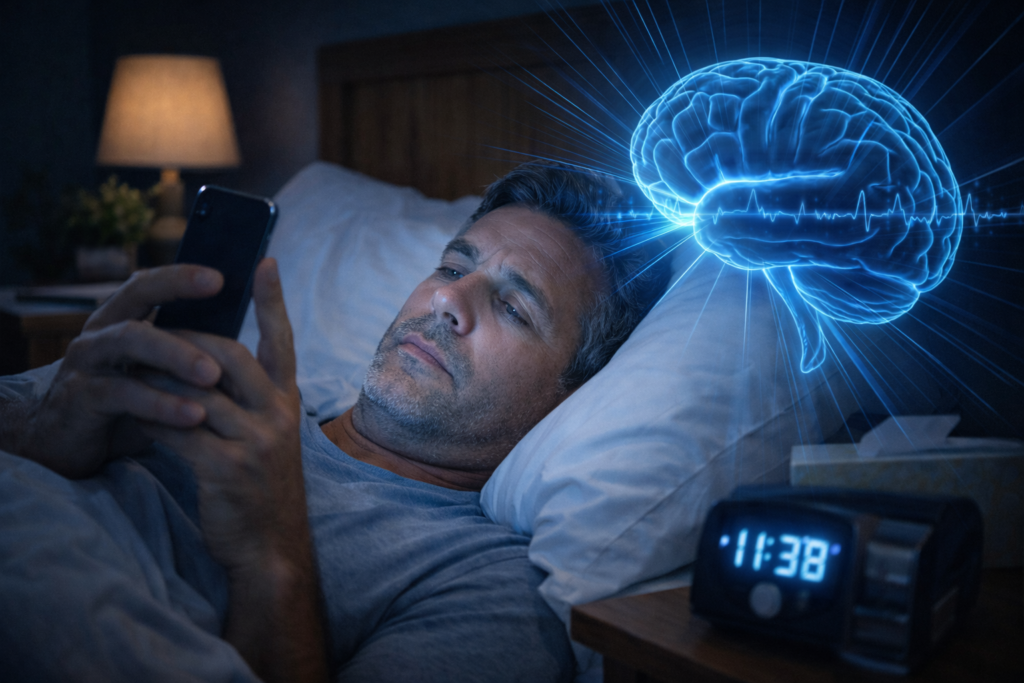 Even relatively short exposure can delay the onset of sleep, reduce sleep depth, and make falling asleep more difficult—especially when screen use becomes a nightly habit.